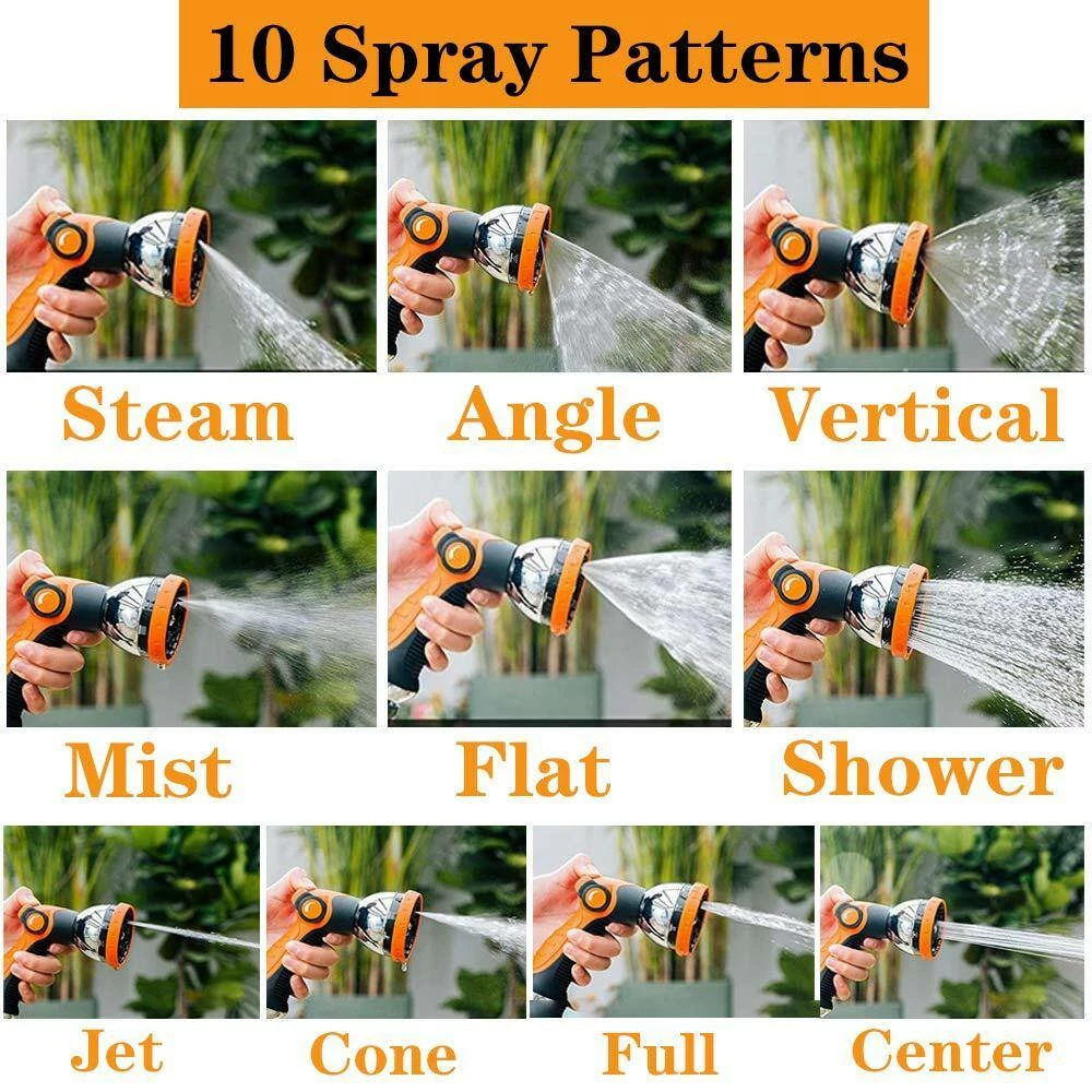 Garden hose spray has 10 adjustable hose head patterns: Center, Full, Flat, Cone, Angle, Shower, Mist, Jet, Rinse, and Soaker. Choose from a high pressure jet to a soft delicate shower.Ideal for cleaning house, car wash, watering plants, flower beds, soaking the soil.