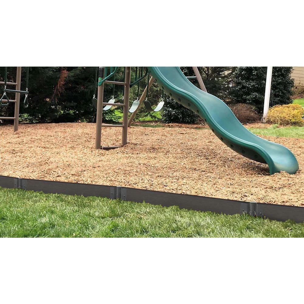 Frame It All playground borders were created by a landscape designer to be an easy, secure and cost-effective way to contain wood and rubber safety surfacing under your child’s play area. Unlike heavy wood ties that splinter (and are labor intensive), Frame It All boards and brackets go together with ease. Our borders are made from sustainably sourced wood fibers and food-grade HDPE recycled plastic, so your children are safe from splinters and hazardous chemicals. Each kit contains composite boards and snap-lock anchor brackets. Each board measures 5.5 in. H Our patented snap-lock brackets simply slide onto each end of a board and fasten securely with locking plugs. Curved kits are also available and can be used interchangeably with straight kits to create natural borders that integrate with your landscape. Did you know. When calculating the dimensions of your playground border, a good rule of thumb is to allow 2x the height of your swing set in front and behind the swing and 6 ft. on either side of the swing set. For example, if your swing set is 7 ft. H, you would want 14 ft. of safety surface in front of and behind the swing, for a total depth of 28 ft.