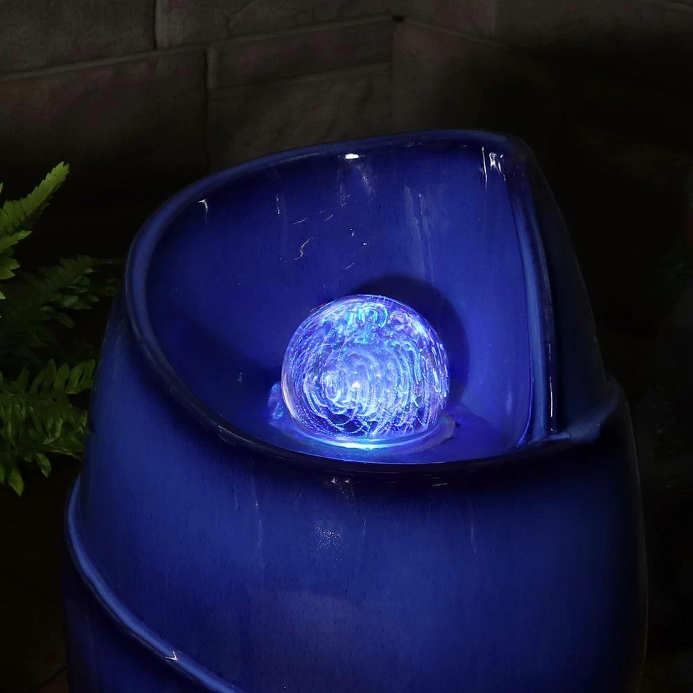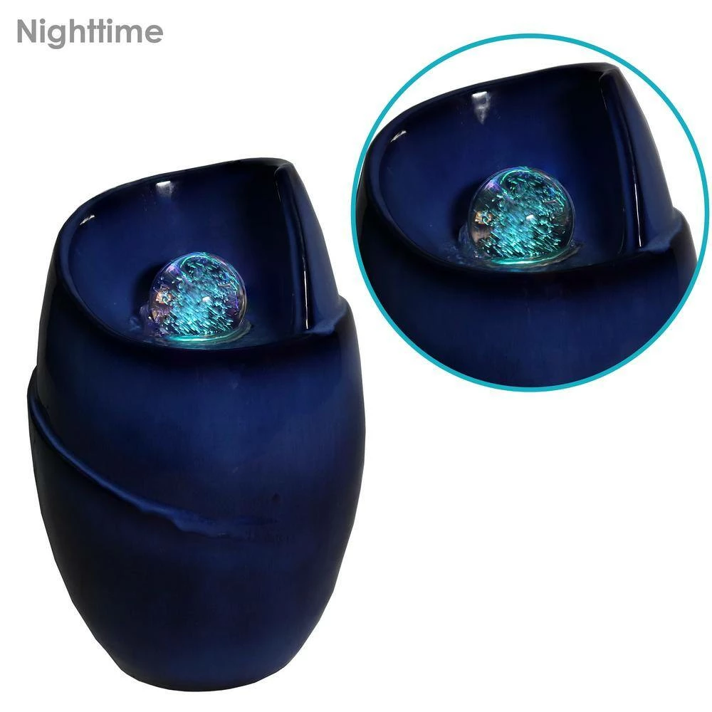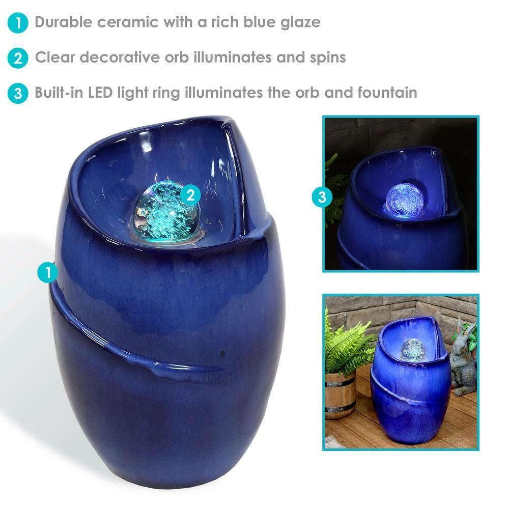 - Looks great on patio: this outdoor water feature is made of durable ceramic with a glazed finish that enhances the beautiful rich blue color, water bubbles under the decorative clear sphere, which is also illuminated by the built-in LED light ring, the lights in the ring ensure that the fountain can be admired and enjoyed at night when the sun goes down, the LED lights in the ring are 0.12-Watt, 6 Lumens, 12-Volt and change colors