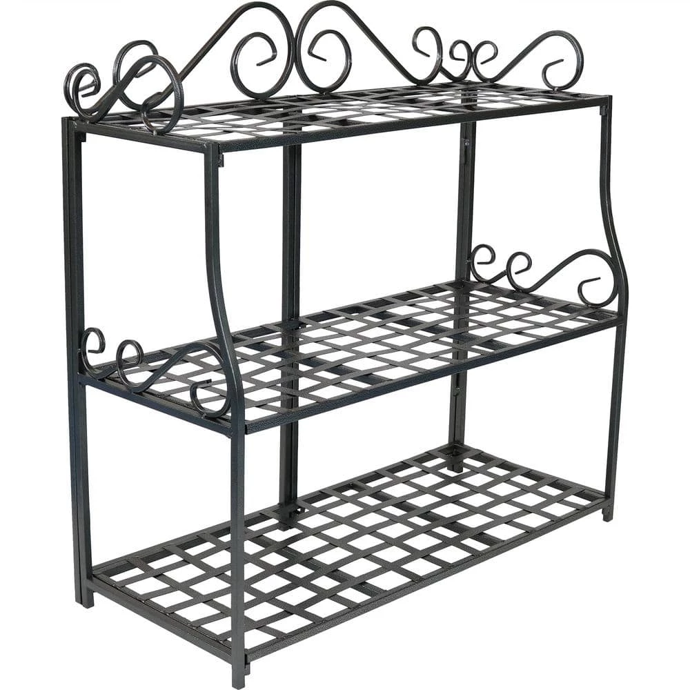Have the perfect place to hold and display potted plants with the 3-Tier Metal Plant Stand with Scroll Edging. This plant stand provides an elegant solution to make potted plants part of your indoor or outdoor decor. Make sure plants get enough sunlight on the top 2-shelves, while keeping essential botanical tools and supplies on the bottom shelf. This piece also makes a great shelving solution for every part of the home. Keep essentials conveniently within reach in the bathroom and kitchen, or use to display family photos and decorative accents in the bedroom, living room and other areas in the house.