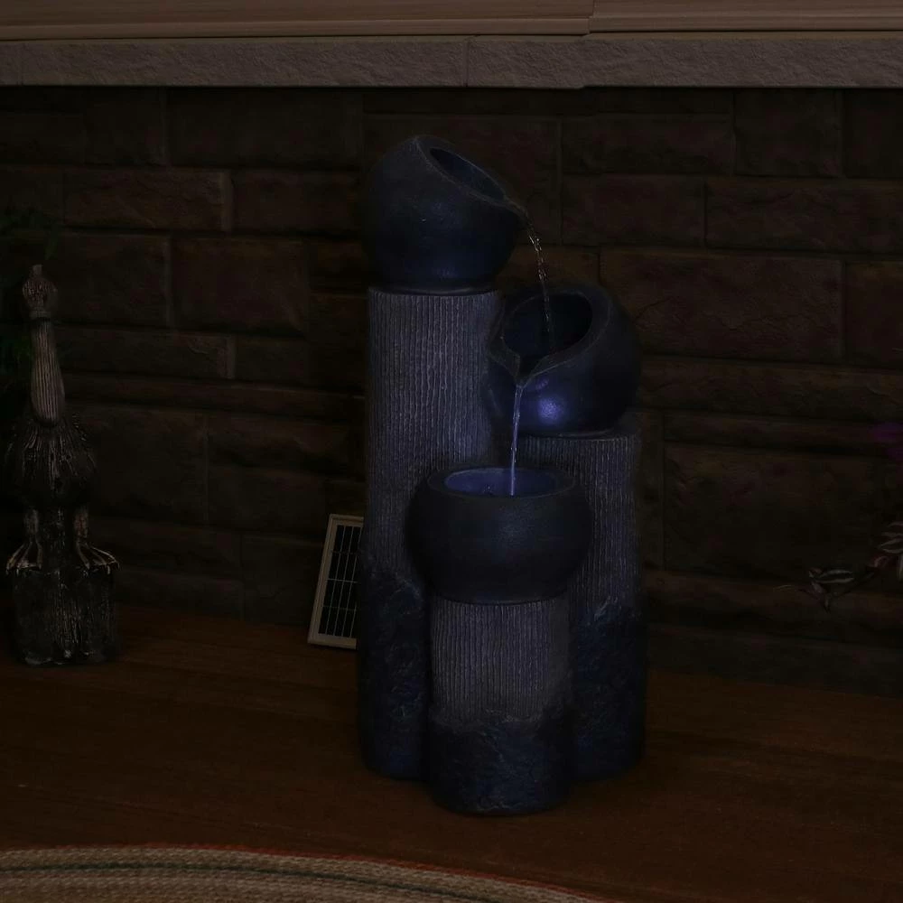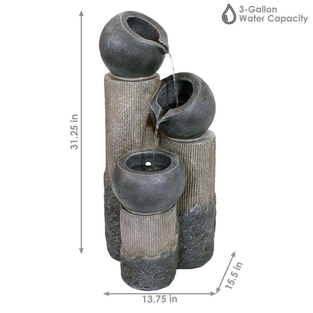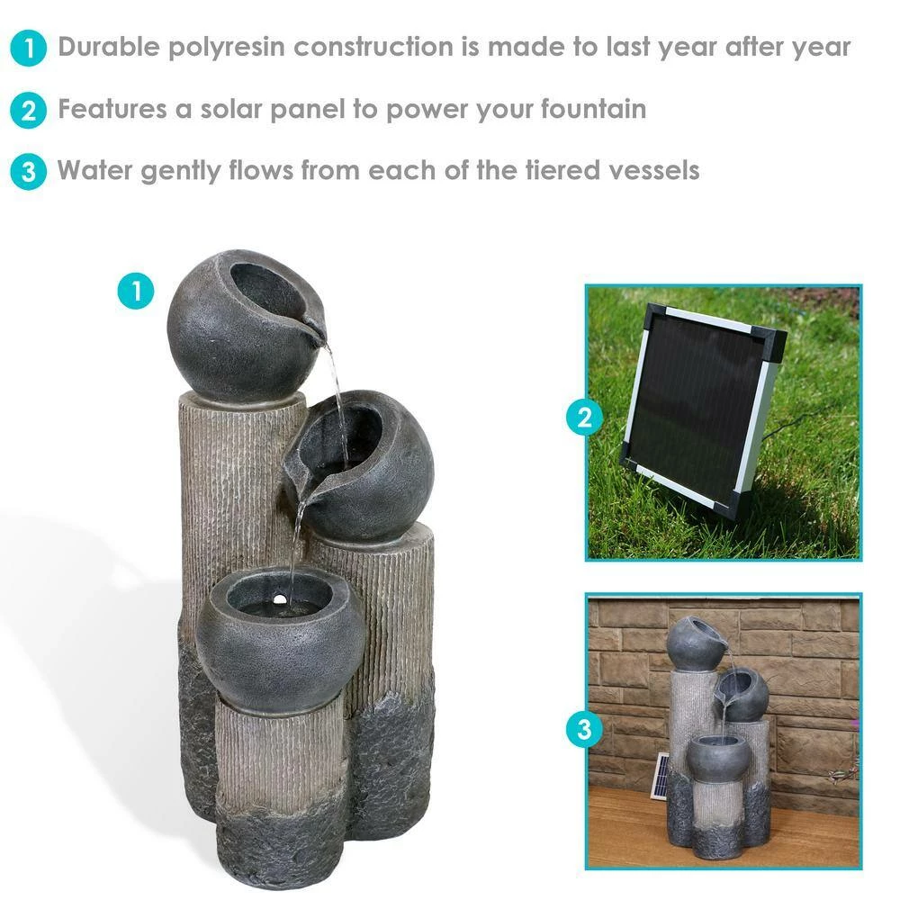 Update any patio or lawn with this decorative and relaxing outdoor water fountain from Sunnydaze Decor. Constructed of durable and easy-to-maintain polyresin, this tiered outdoor water feature is designed with a variety of textures and neutral colors to enhance any outdoor living space. Water gently flows from each of the tiered vessels for a peaceful decorative accent that harnesses the power of the sun via the included solar panel. When the solar panel is in direct sunlight, the pump will be powered by solar energy and the battery pack will recharge. Once fully charged, the battery will power the fountain for up to 4-hours. The battery will also automatically run the fountain when it is cloudy or nighttime.