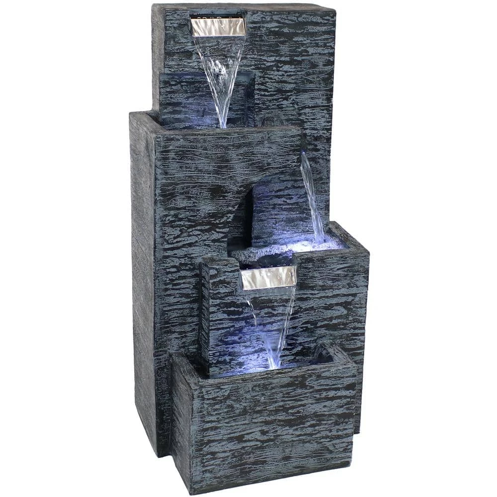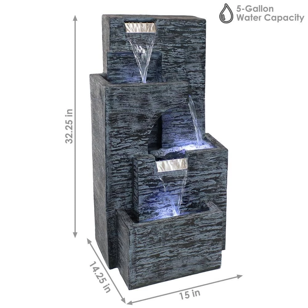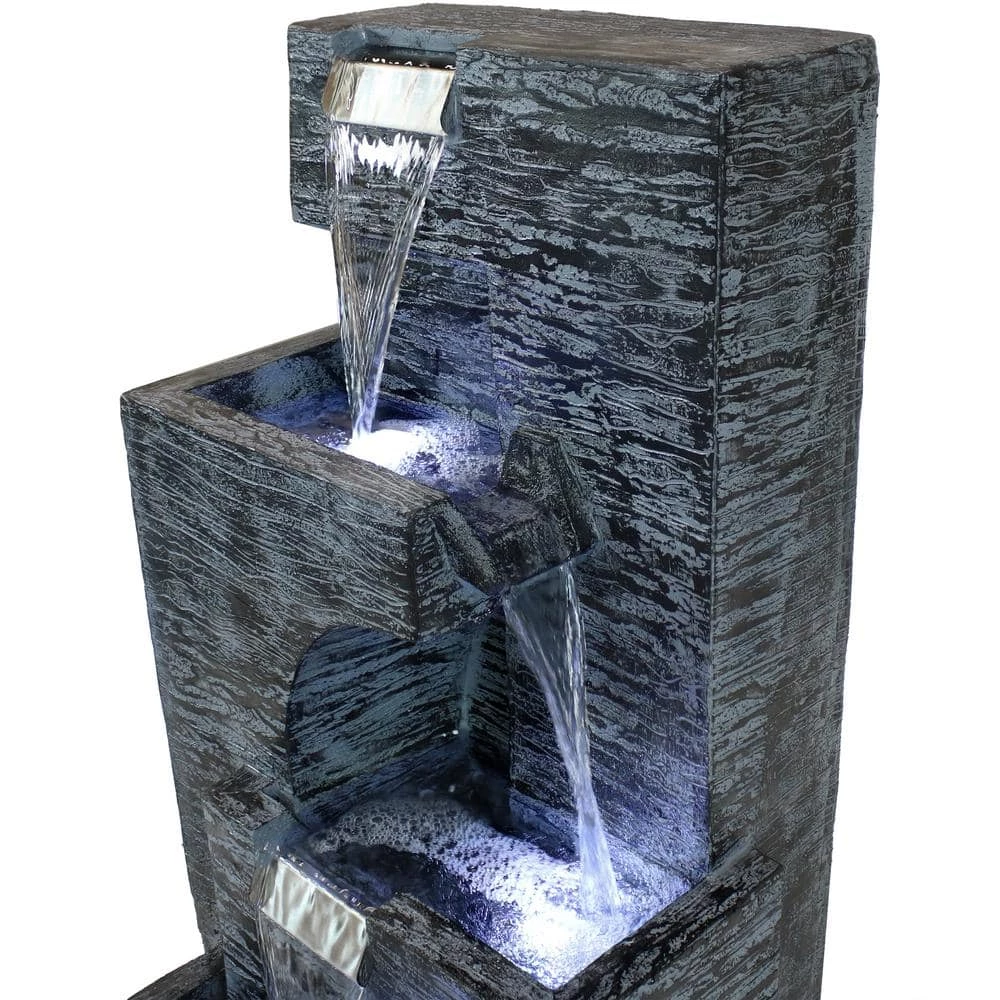 Add a touch of modern elegance to your patio decor with this contemporary water fountain. Enjoy the relaxing sounds of falling water as it tumbles from 1 tier to the next. Made from durable yet lightweight material, it features a realistic faux stone appearance. This water fountain also features three white LED lights to illuminate the fountain after the sun sets.