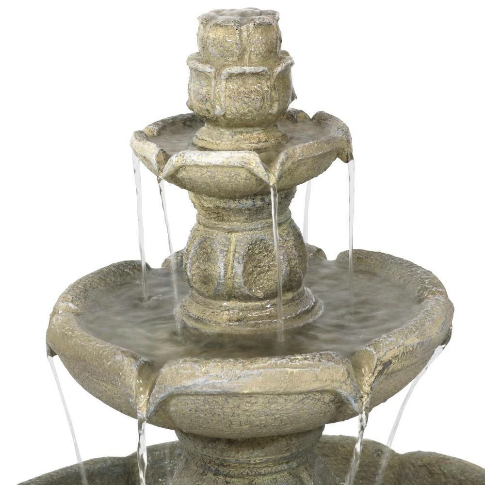 The birds in your neighborhood will love this outdoor fountain as water gently falls down the tiers into the main basin. You too will enjoy this beautiful feature for its soothing water sounds. Since it is recirculating, this garden centerpiece requires no plumbing. Its electric pump plugs into a standard outlet and its fiberglass construction makes it incredibly weather resistant as well as moveable. Includes the spin-lock stability system, which secures all the pieces together to ensure that the unit is properly assembled and secure in your outdoor space.