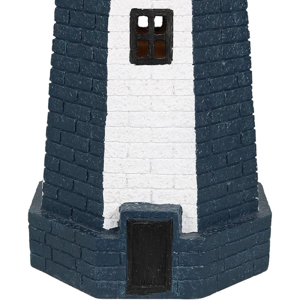 This nautical-inspired outdoor solar LED lighthouse is sure to add charm to any backyard, patio or other outdoor space. Featuring a durable resin-metal construction, window and door detailing as well as push-button on/off switch, this piece is engineered to impress and last. The decorative lighthouse structure is designed to resemble a lighthouse 1 would find on the coast with its brick detailing and vibrant stripes. Place it anywhere it will collect direct sunlight during the day charging the batteries housed below the built-in solar panel and it will light up any landscape at night for up to 4-hours to 6-hours.