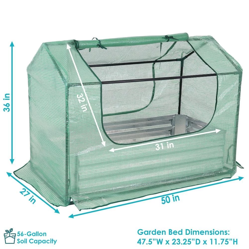 - Covered raised garden bed, the garden bed measures 47.5 in. W x 23.25 in. D x 11.75 in. H and weighs 10.4 lbs. it has a soil capacity of 56 Gal. (12,976 cu. in.), the mini greenhouse measures 50 in. W x 27 in. D x 36 in. H and weighs 4.8 lbs. it features two 31 in. L x 32 in. W doors