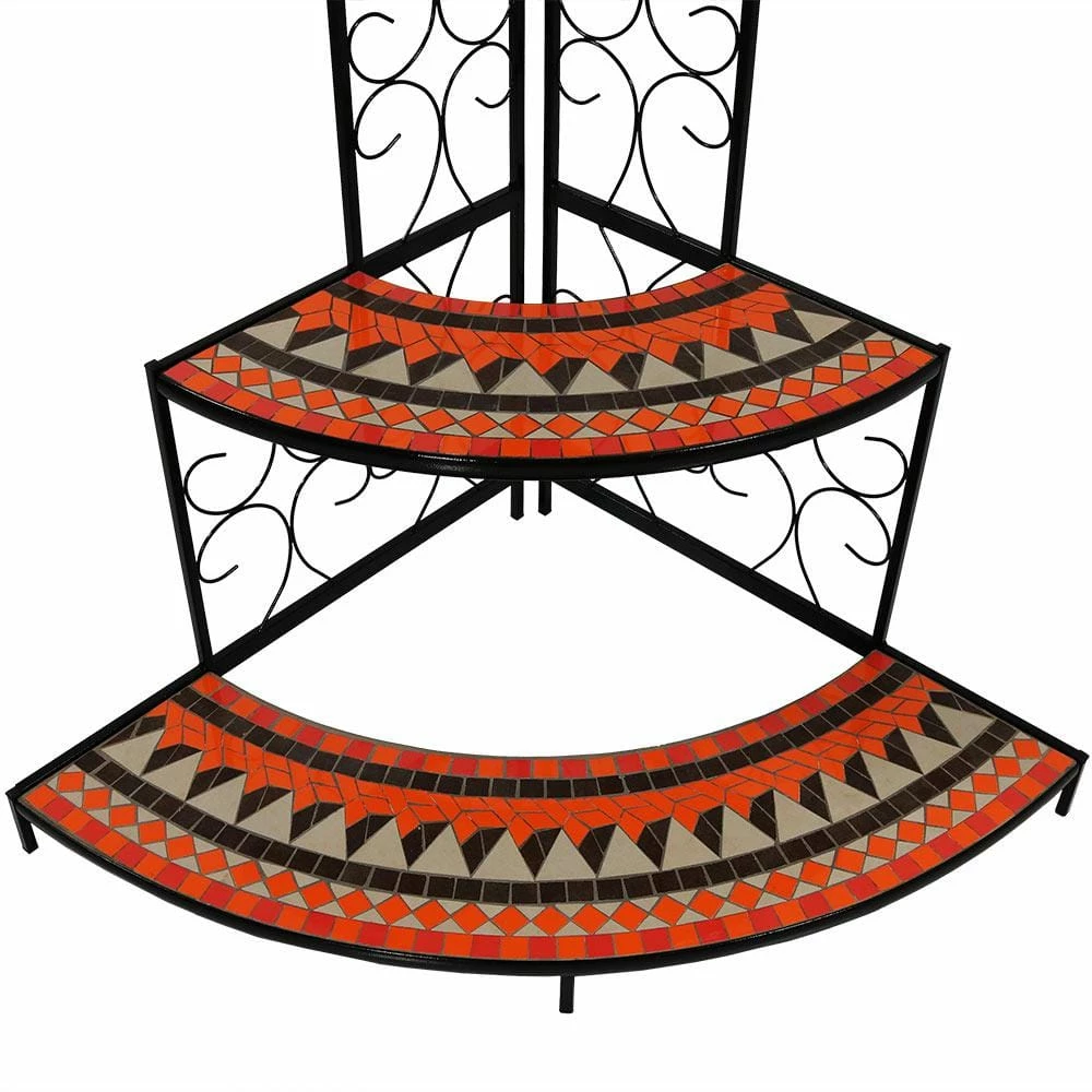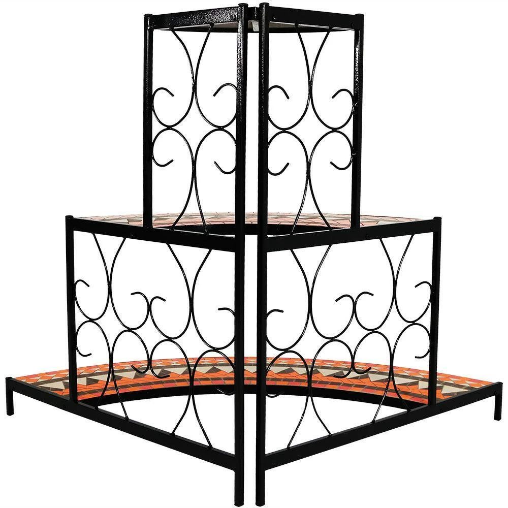 Add charm and cheer to any outdoor space by using this step-style plant stand for planters on the patio, deck, or balcony. May also be used indoors in the foyer, office, dining room, living room, sun room, or bedroom. The stand features a black powder-coated steel construction with multi-colored mosaic tiled levels for extra durability, style, and weather-resistance.