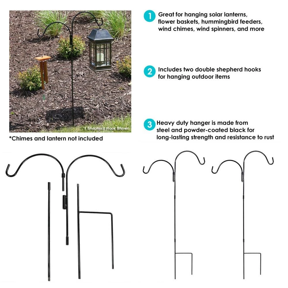 This set of 2 double shepherd hooks are the perfect solution for hanging bird feeders, solar lanterns, seasonal decorations, wind spinners and wind chimes. Each piece features 2 hooks so it is easy to hang up to 4 items. Designed to last, the powder-coated steel construction ensures that the hooks will serve for many seasons.