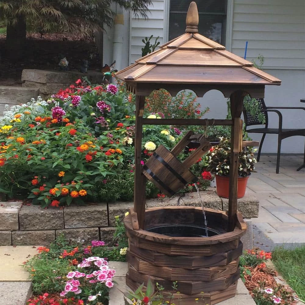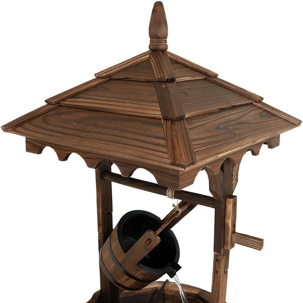 Add whimsical appeal to your yard or garden with this outdoor electric wood wishing well fountain. Constructed of real fir, this wishing well fountain features durable plastic liners in the bucket and well. Embellishments on the roof give this fountain added appeal, including the scalloped trim and the ornamental finial at the top. A decorative pulley adds a realistic detail to this wishing well fountain. The included electric submersible JR-350 pump recirculates the water through the fountain and is easy to set up. No plumbing is required to install the fountain. Once the fountain is assembled, simply fill it up with water and plug the pump into a standard outdoor electrical outlet.