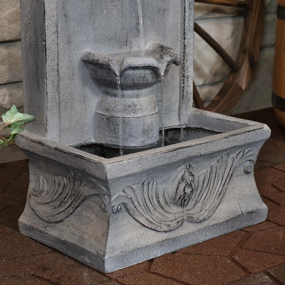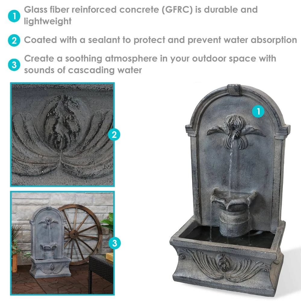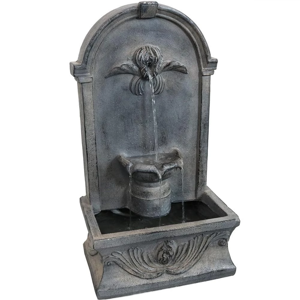 This decorative water fountain can be used both indoors and outdoors to bring the soothing sounds of flowing water to your home. This beautiful French-inspired fountain has a flat back and is best displayed against wall or flat surface on the patio, yard or garden. Made from durable Glass Fiber Reinforced Concrete (GFRC), this fountain is sturdy yet lightweight to make moving it to any desired location easy. This fountain features a spout that pours water into a cup and then flows over into the basin below. The water is recirculated through the included submersible pump and back through the fountain. Operating the fountain is easy, once the fountain is in place and filled with water, simply plug it into a standard electrical outlet.