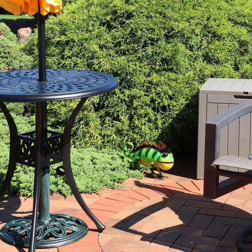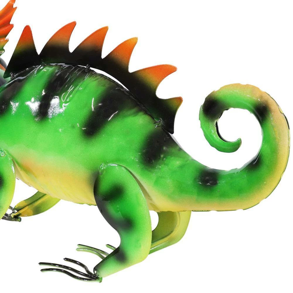 Greg and Gary the Green Chameleons are here to bring some tropical charm to the patio or backyard. These adorable chameleon garden statues are constructed of durable iron sheet and can be used in a variety of places both indoors and outdoors. These charming pieces of metal yard decor feature cheerful expressions, large eyes and friendly smiles to greet guests to the home. Plus, they feature shiny and vibrant striped bodies, bold spikes and cute, curly tails.