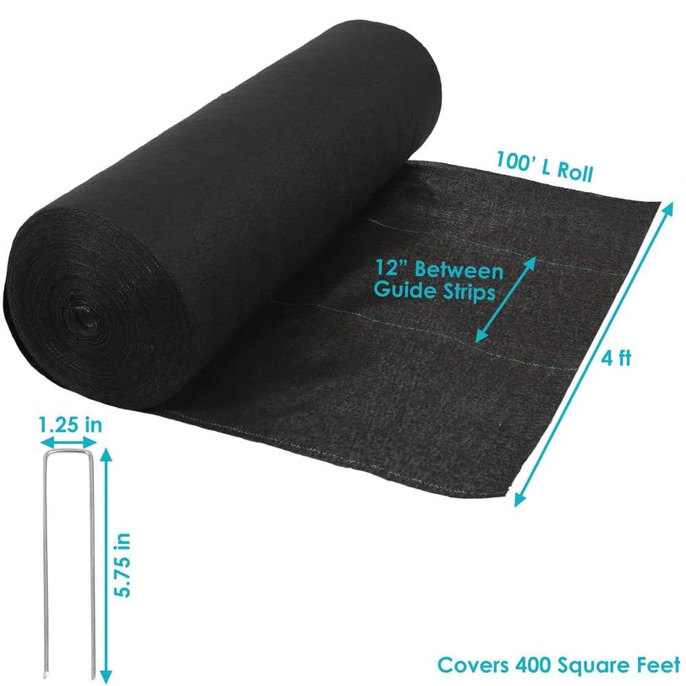 - Plenty of coverage: this landscape fabric ground cover measures 4 ft. W x 100 ft. D and weighs 17.2 lbs. the entire roll covers 400 sq. ft. the fabric is 0.5 mm T, the garden staples are 1.25 in. W x 5.75 in. H with 2.75 in. T metal, you can easily cut the roll to fit your garden bed, tree or other areas you want to install this barrier, especially with the handy guide stripes on the fabric, the strip are spaced 12 in. apart