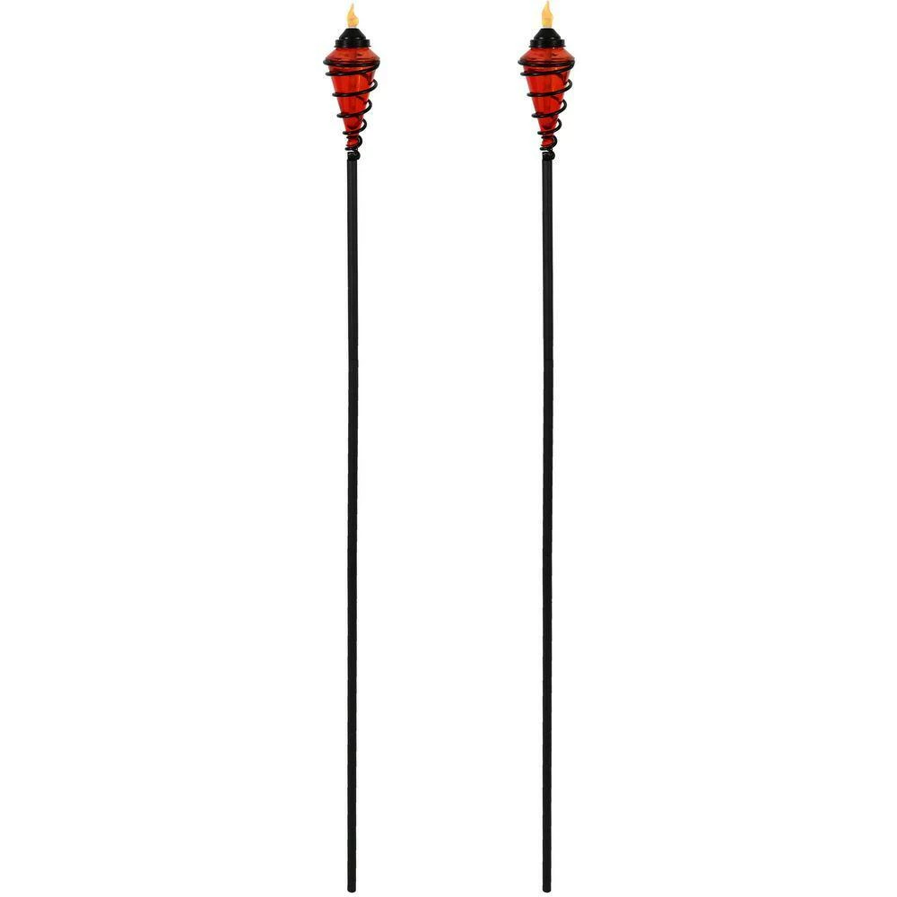 - Complete pair of torches: set of modern landscape torches includes two 4-section poles with 2 blue glass fuel containers; also includes 2 fiberglass wicks for a flame that burns longer; 2 metal snuffers are attached to each torch by a chain, so you safely extinguish flames when you’re done using the torches