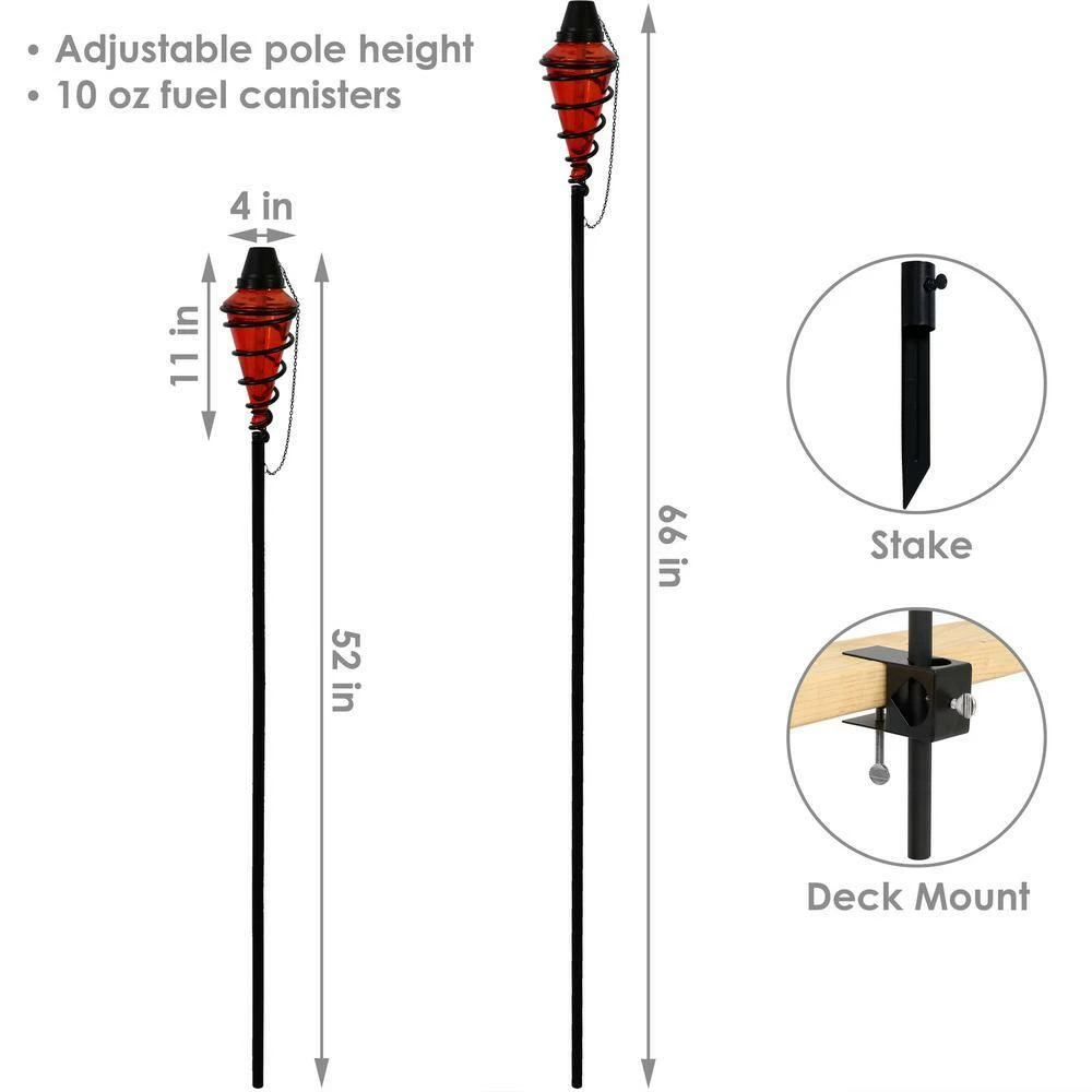 - Add a glow to your backyard: outside torches measure 4 in. Dia x 66 in. H (when assembled with all 4 pole sections); each torch weighs 2.4 lbs.; glass torch vessel with metal casing is 11 in. H; each fuel canister holds approximately 10 oz. of fuel; perfect to add to your garden, lawn or patio