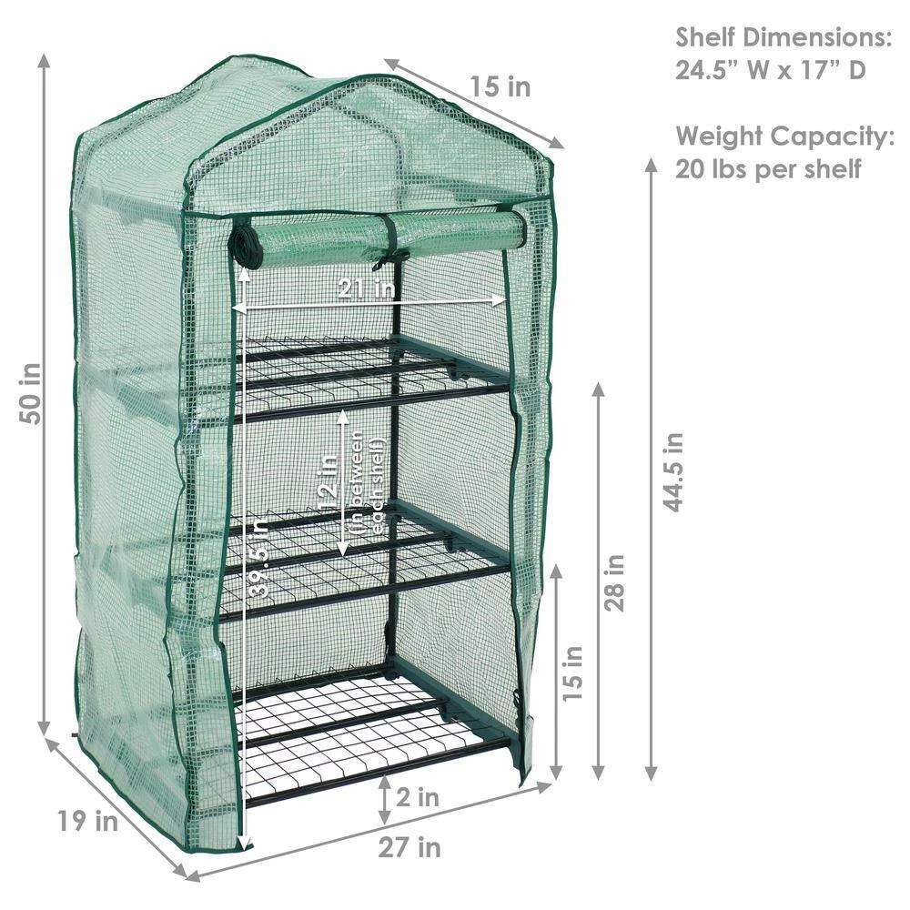 - Portable patio greenhouse: move this small greenhouse across your yard, patio, or deck easily to ensure your plants receive the best sunlight to grow, this mini greenhouse measures 27 in. W x 19 in. D x 50 in. H and weighs 6.4 lbs. each shelf is 24.5 in. W x 17 in. D and has a weight capacity of 20 lbs. the bottom shelf is 2 in. from the ground, the middle shelf is 15 in. from the ground, and the top shelf is 28 in. from the ground with 12 in. between each shelf, the door measures 21 in. W x 39.5 in. H