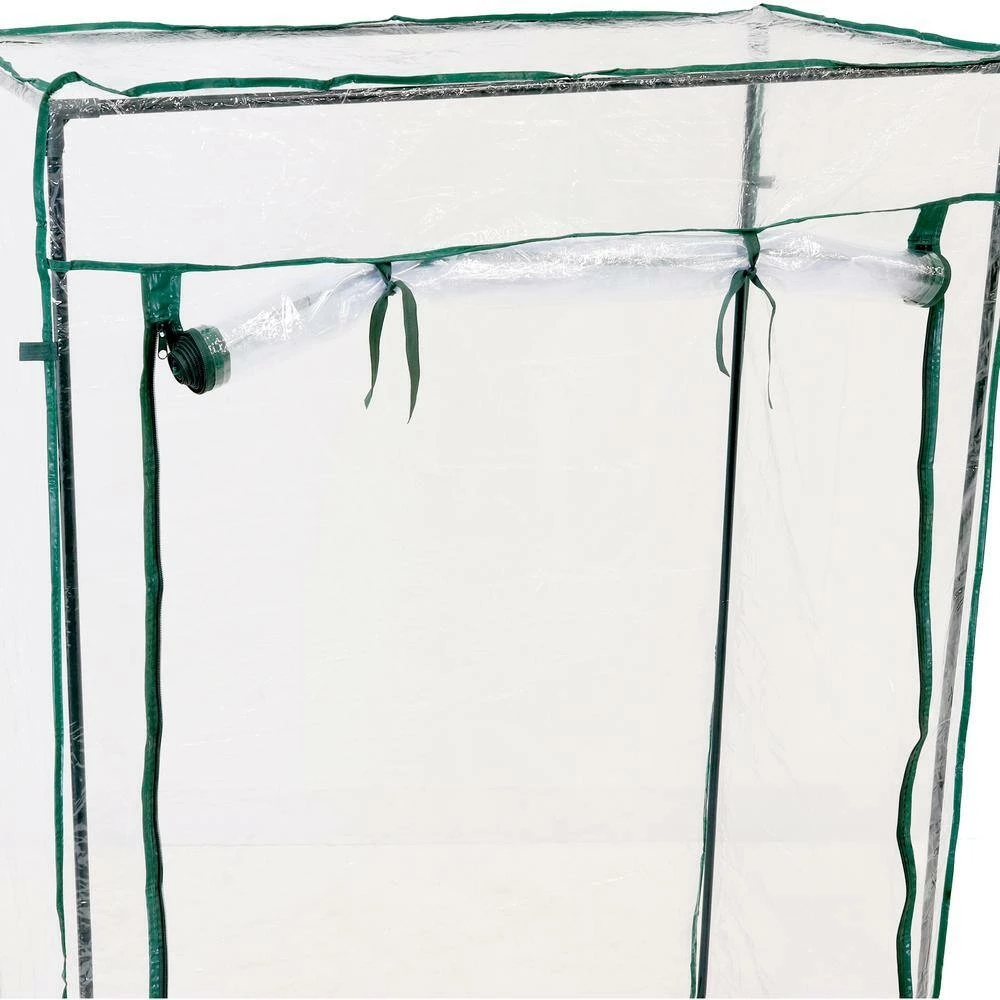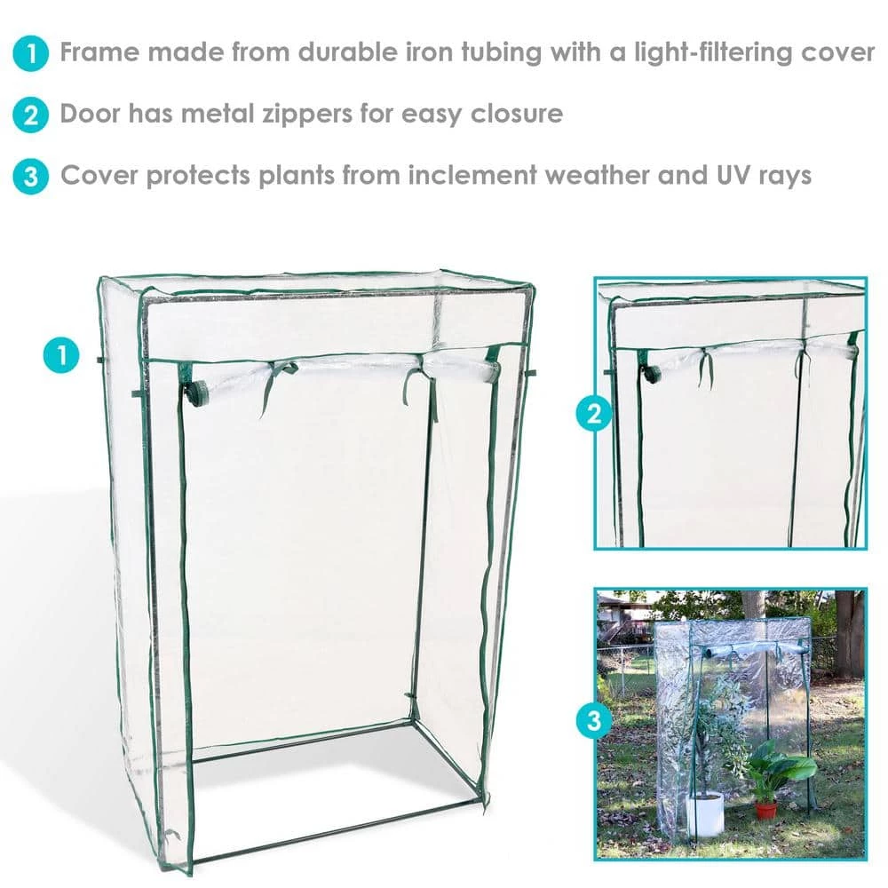 Grow beautiful vegetables, fruits and flowers easily with this portable tomato starter greenhouse. Place potted plants on the ground in the greenhouse or build the greenhouse over a garden to protect and promote growth for your tomatoes, peppers, beans and other plants. Durably constructed from an iron tube frame with a PVC covering coated with a UV ray protective finish, this tomato house is sure to keep your plants safe during inclement weather. The PVC cover is transparent to allow plenty of Sunlight to shine through. A roll-up door with side zippers keeps your plants contained and allows you to control airflow in and out of the greenhouse.