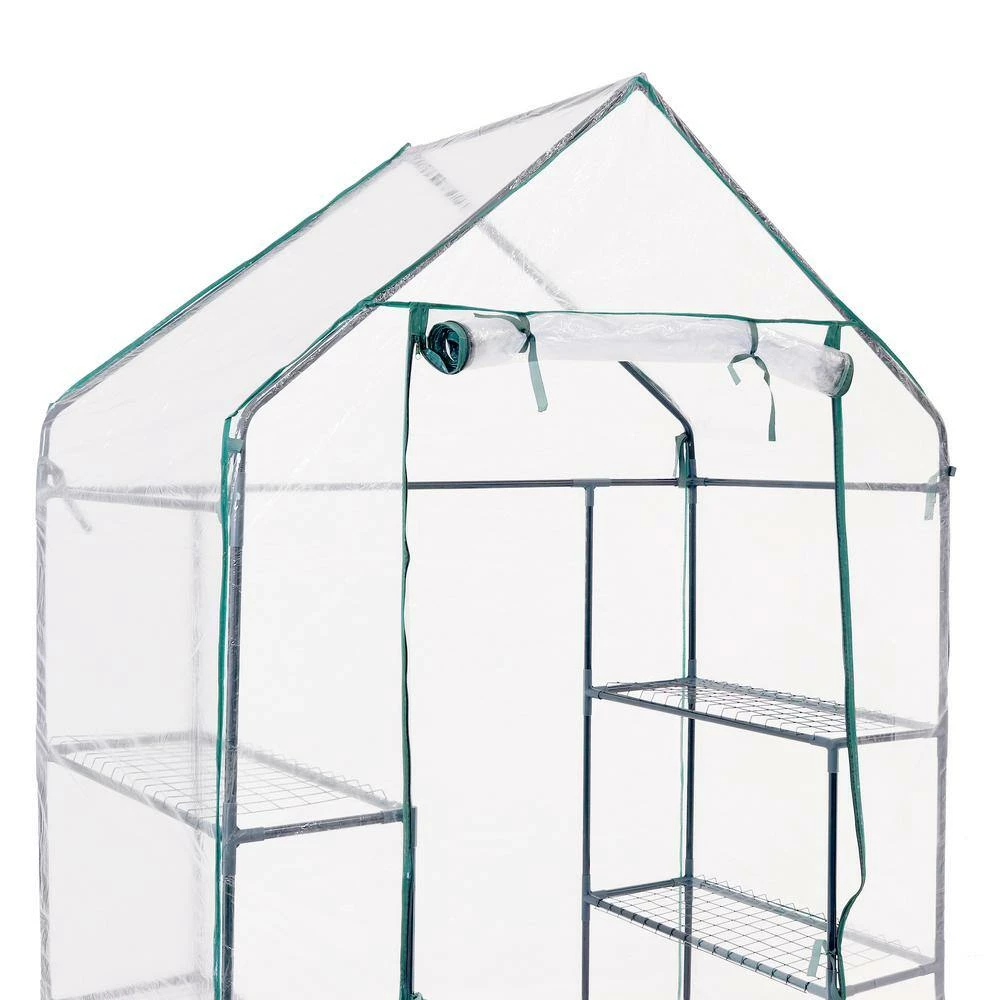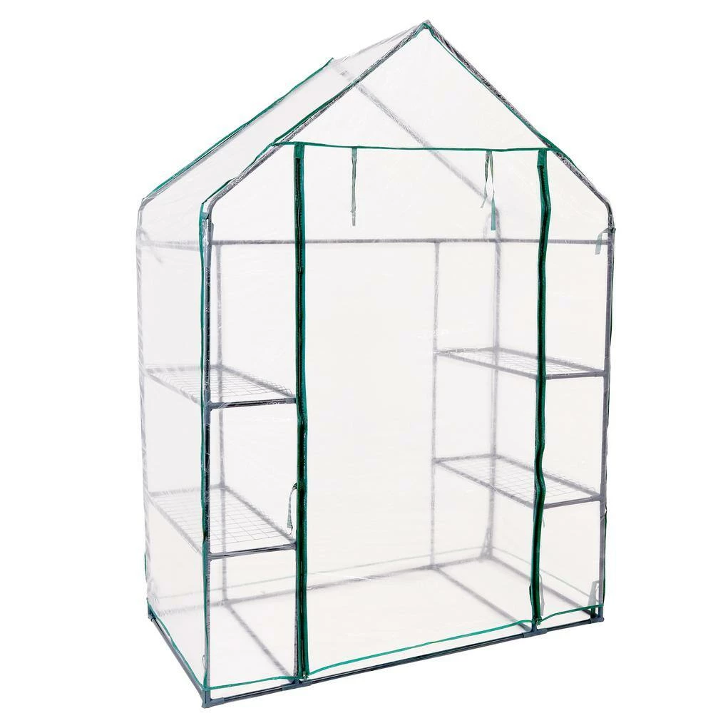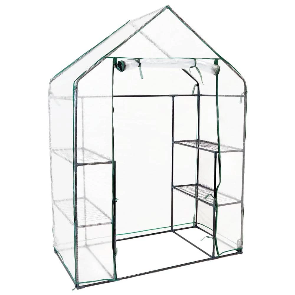 Have a successful growing season with help from this portable walk-in greenhouse. with 4-shelves for growing plants and storing supplies, this small greenhouse for outdoors is perfect for creating the ideal growing climate for all your favorite vegetables, herbs, fruits and flowers. This walk in greenhouse with shelves is durably constructed from an iron tube frame with steel wire shelves and a PVC covering coated with a UV ray protective finish. The cover protects plants from inclement weather, like frost, excessive heat and moisture. The cover is transparent so light can filter through to ensure plants receive the perfect amount of Sunlight. A roll-up door with zippers allows you to control airflow in and out of the greenhouse and easy access to plants.