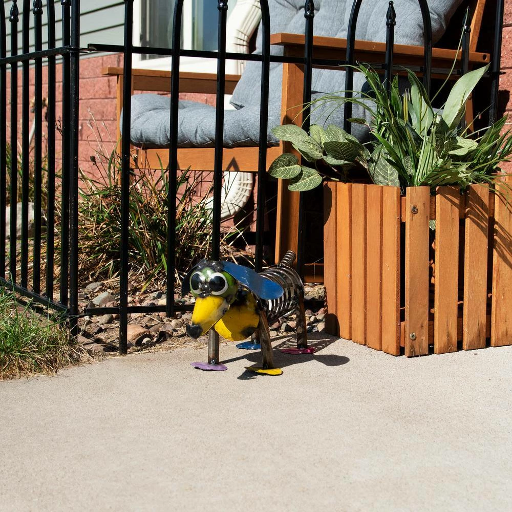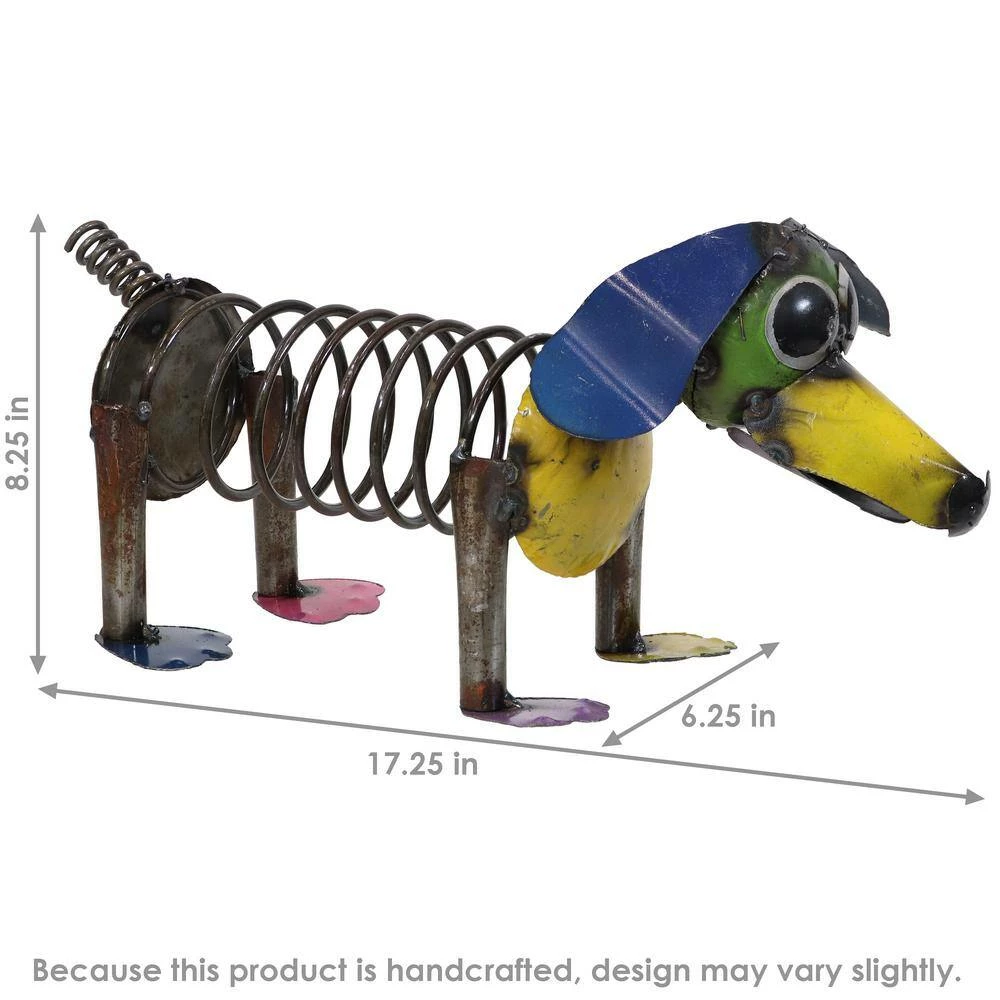 Add a touch of fun to the home or garden with this rustic metal yard art dog statue. This playful pup is made from heavy-duty metal and features a unique durable Spring body. This small rustic metal art sculpture can be used either indoors or outdoors. It’s perfect for the living room, patio, lawn or Sunroom. If used outdoors, this rustic metal lawn art will develop a natural patina over time. Due to the statue’s hand-painted design, colors may vary.