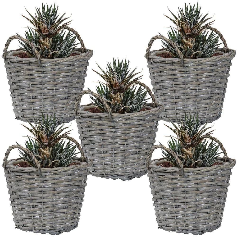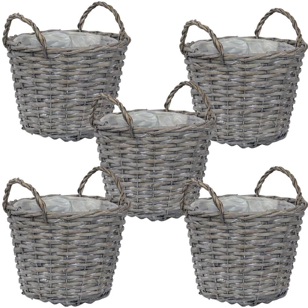 Create beautiful plant and flower displays with this wicker planter basket set. This set includes 5 identical indoor planter baskets. Arrange them together for a cohesive look or place them individually throughout the house. Each pot planter basket is made of willow wicker with a sturdy steel wire frame. These baskets also feature an attached plastic liner for easy maintenance.