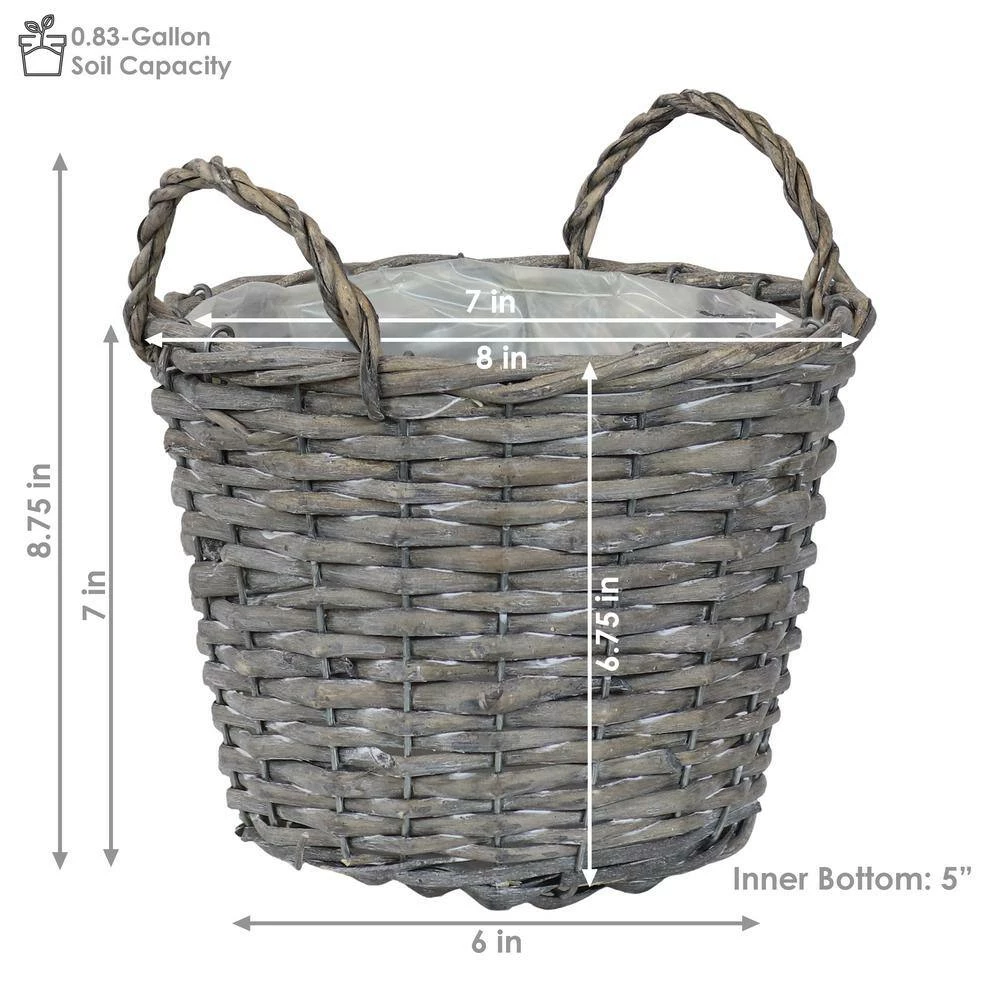 - Set of 5 wicker basket planters: each planter has an 8 in. top outer diameter (6 in. outer bottom diameter) x 8.75 in. outer height including the handles (7 in. when not including the handles), each planter has a 7 in. inner top diameter (5 in. inner bottom diameter) x 6.75 in. inner height, each planter weighs 0.4 lbs. and has a soil capacity of 0.83 Gal. (0.11 cu. ft.)