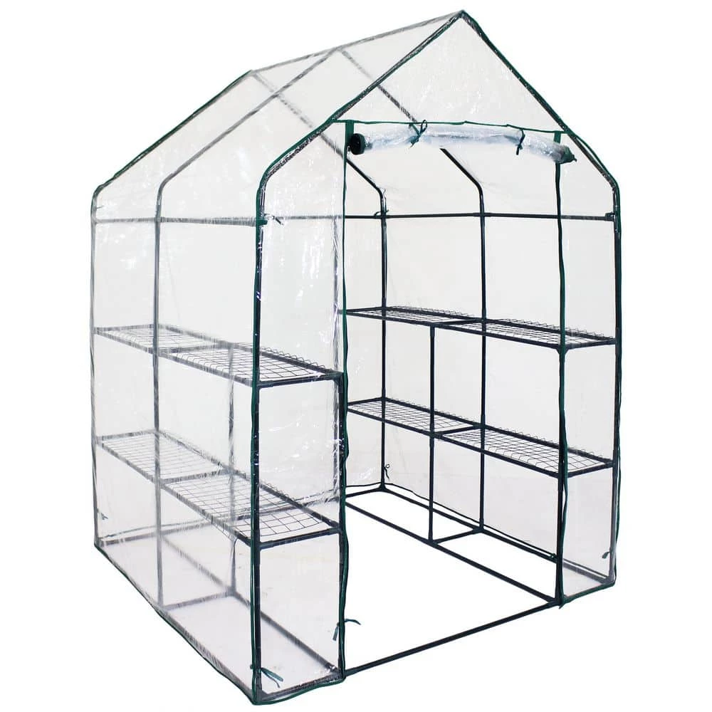 Have a successful growing season this year with help from this portable walk-in greenhouse. With 4 shelves for growing plants and storing supplies, this small greenhouse for outdoors is great for creating the ideal growing climate for all your favorite vegetables, herbs, fruits, and flowers. This greenhouse is durably constructed from an iron tube frame with a PVC covering that is coated with a UV ray protective finish. The cover protects plants from inclement weather like frost, excessive heat, and moisture. The cover is transparent so light can filter through to ensure plants receive the right amount of Sunlight. This greenhouse features 4 shelves that are made from steel wire to hold planters and keep supplies close at hand. Store the heaviest planters on the bottom shelf. A roll-up door with zippers allows you to control airflow in and out of the greenhouse and easy access to plants.