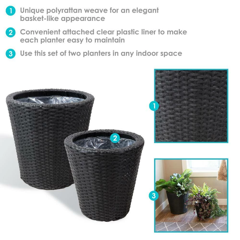 Grow beautiful houseplants with this set of 2 decorative planters. Designed for indoor use, these stylish flower pots feature a unique polyrattan weave that gives each flower pot an elegant basket-like appearance. These planter pots are designed for indoor use and are the perfect addition to your living room, entryway, or sunroom. These plant containers are made from durable polypropylene for a long-lasting product life and feature a convenient attached clear plastic liner to make each planter easy to clean.