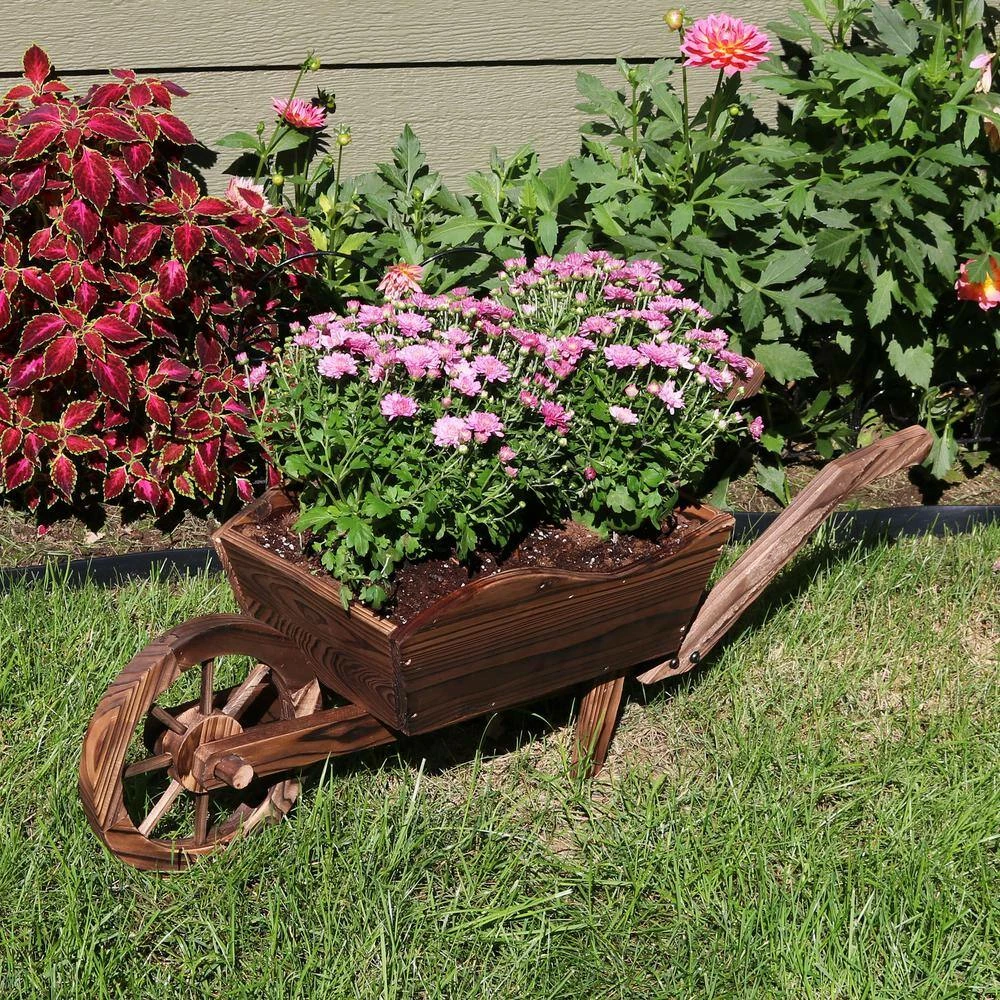 Grow favorite plants, flowers or vegetables in rustic country style with this wooden wheelbarrow garden planter by Sunnydaze Decor. Place the charming planter in the garden, yard or on the patio. Featuring a fir wood construction with a medium finish, the classic traditional style of the wheelbarrow planter is an excellent addition to a farmhouse decor scheme or traditional landscaping.