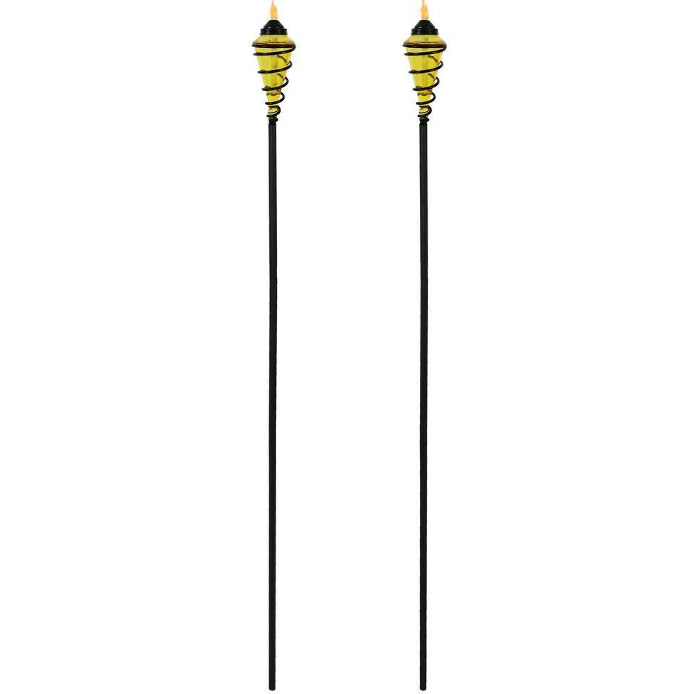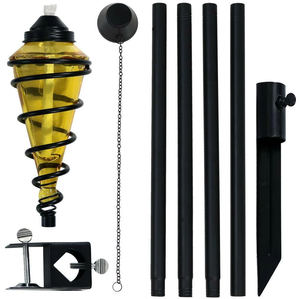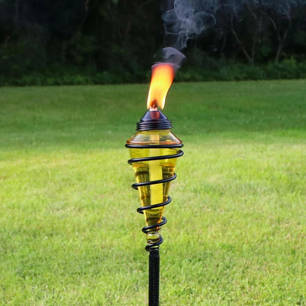 - Complete pair of torches: set of modern landscape torches includes two 4-section poles with 2 blue glass fuel containers; also includes 2 fiberglass wicks for a flame that burns longer; 2 metal snuffers are attached to each torch by a chain, so you safely extinguish flames when you’re done using the torches