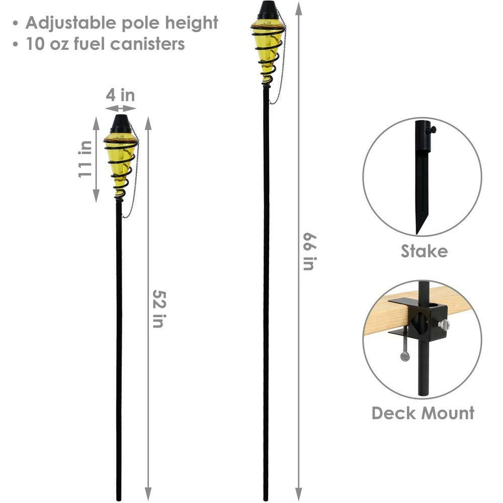 - Add a glow to your backyard: outside torches measure 4 in. Dia x 66 in. H (when assembled with all 4 pole sections); each torch weighs 2.4 lbs.; glass torch vessel with metal casing is 11 in. H; each fuel canister holds approximately 10 oz. of fuel; perfect to add to your garden, lawn or patio